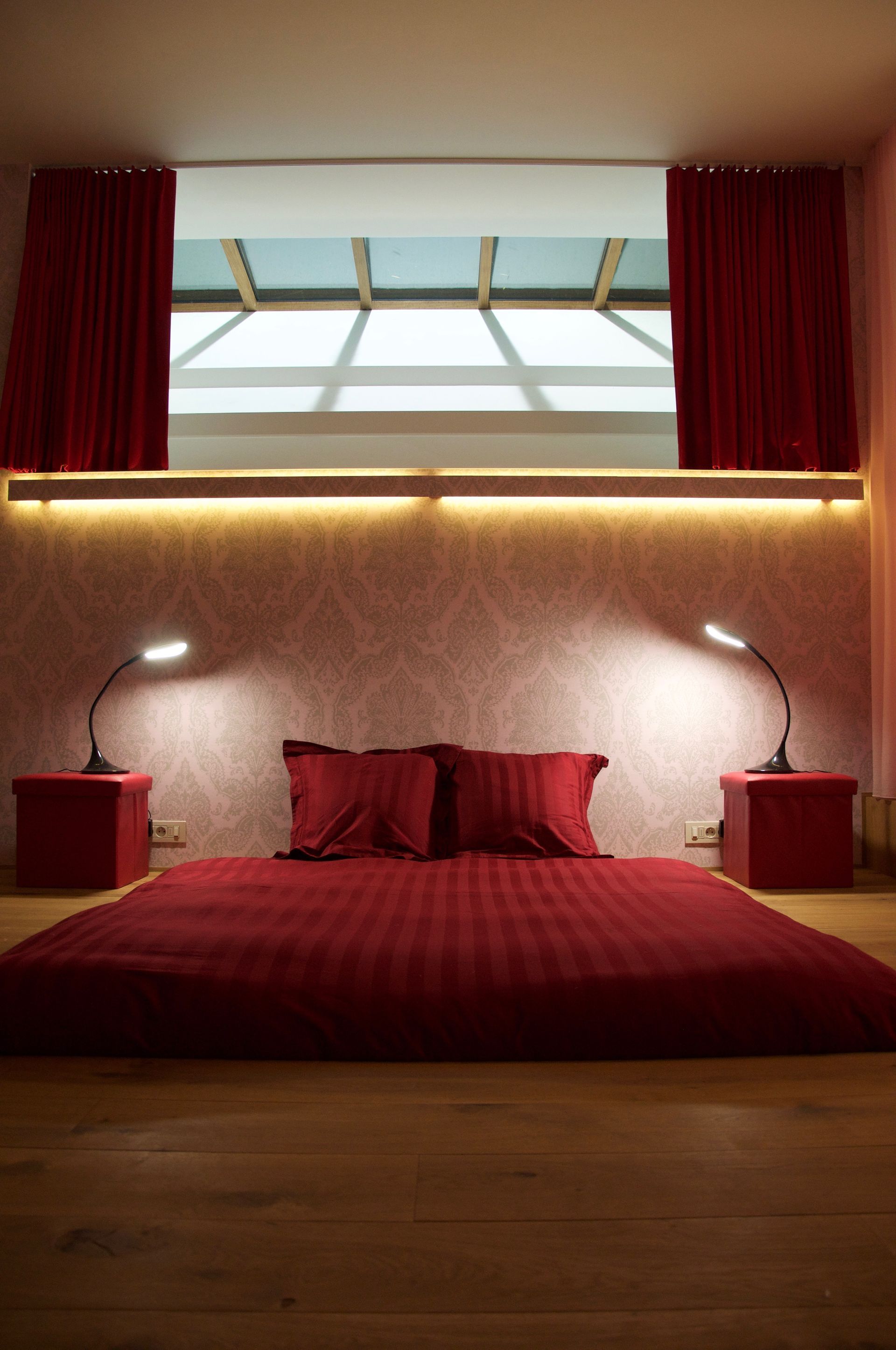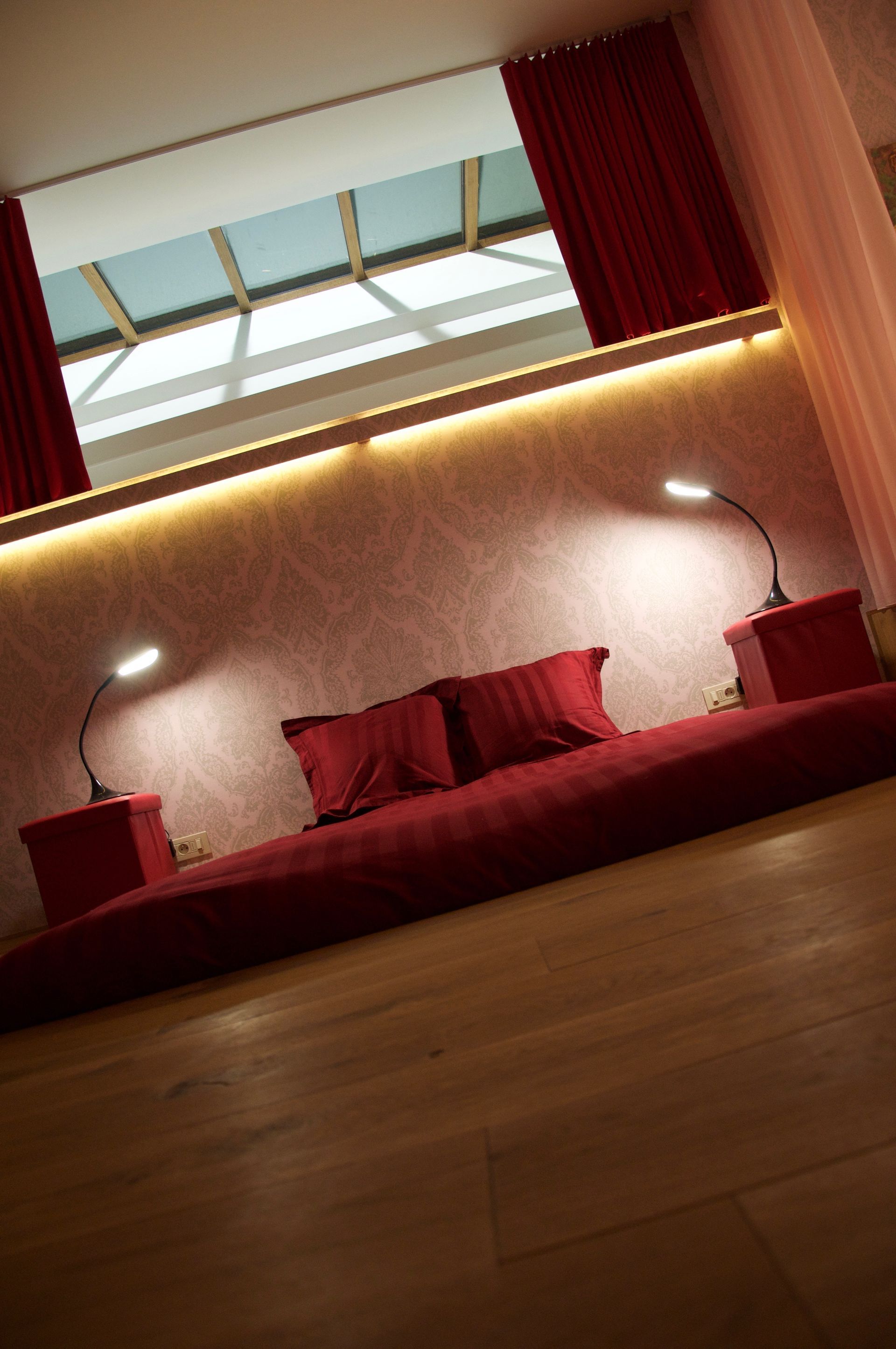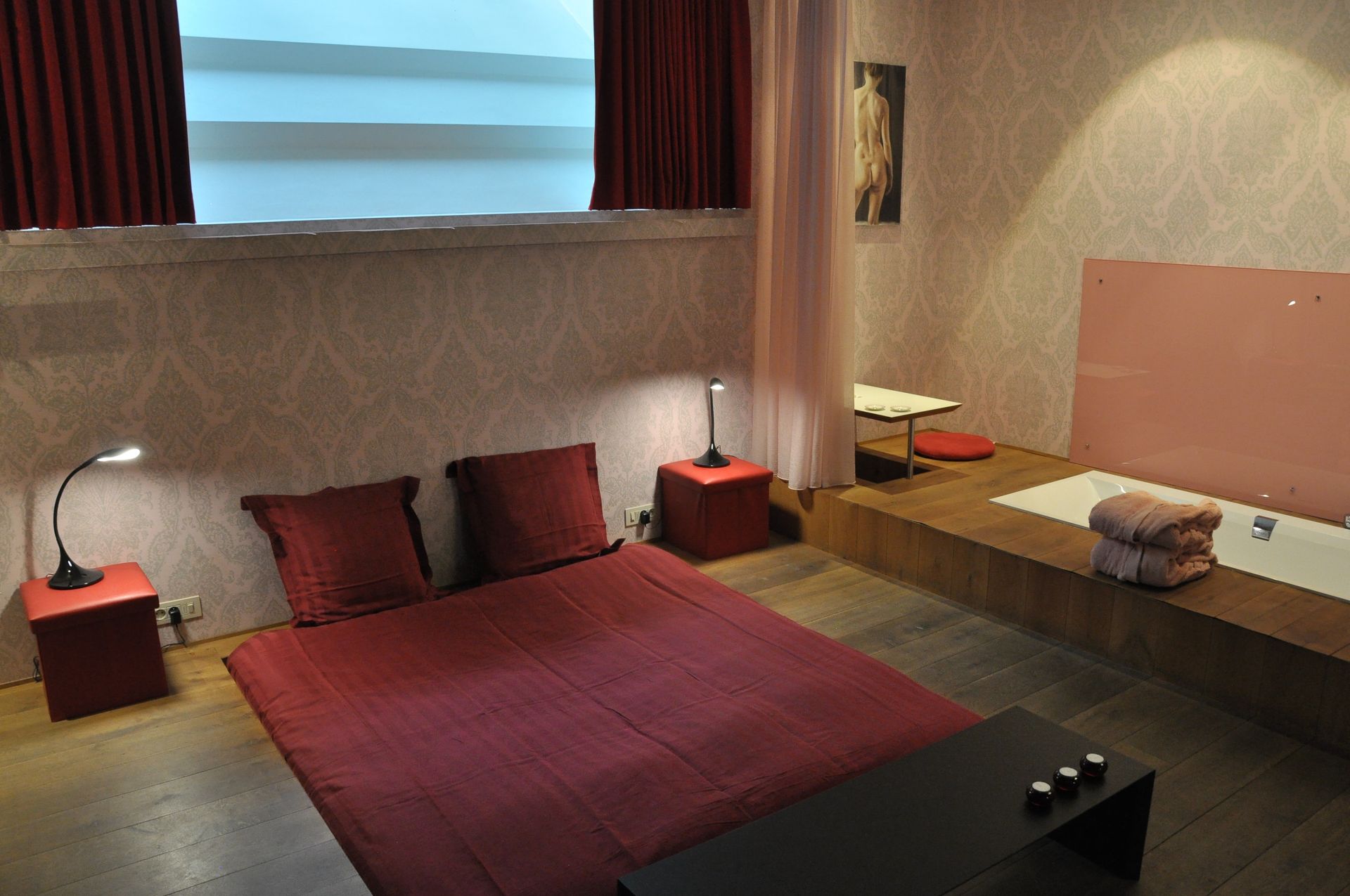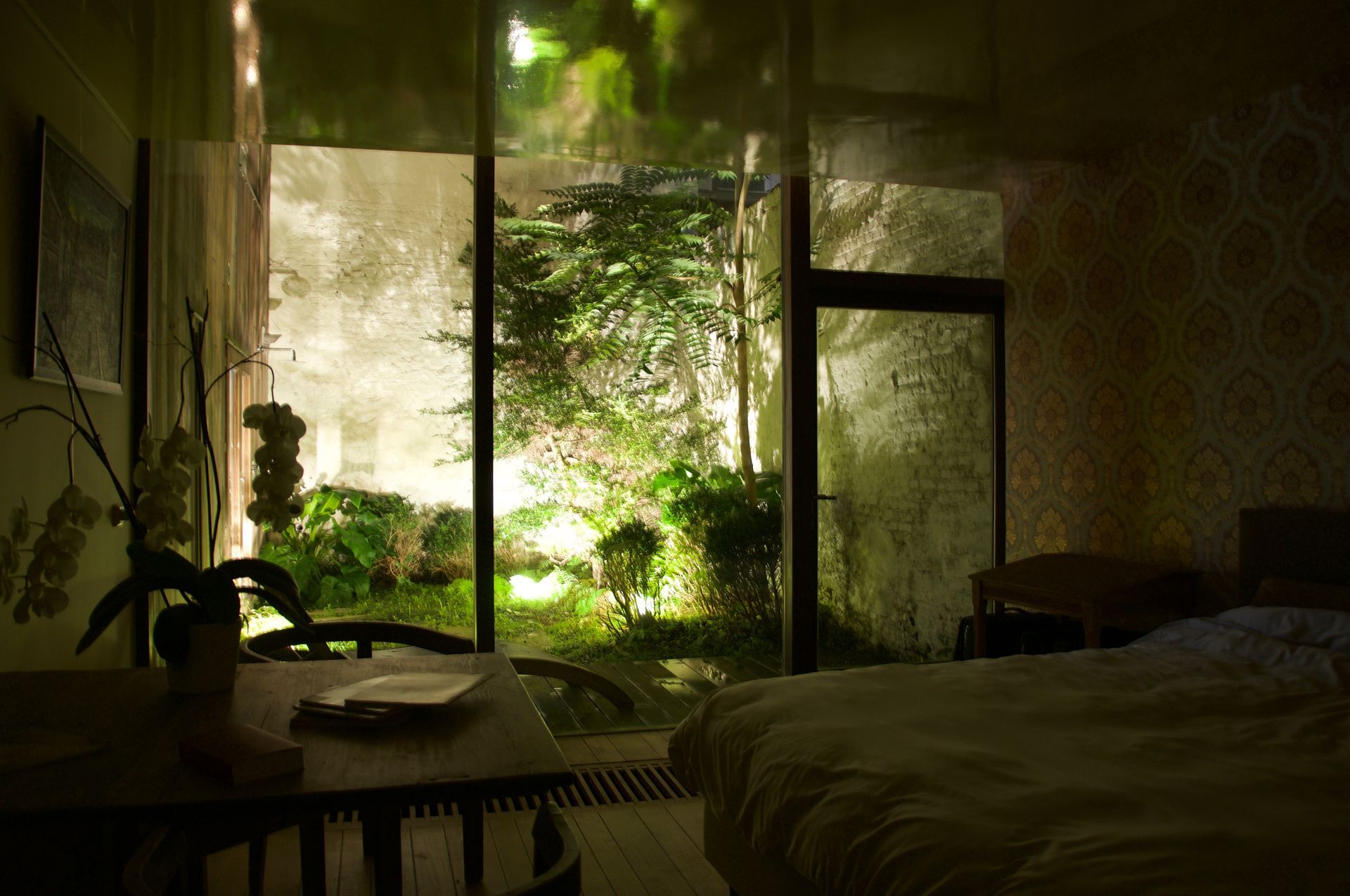 In the Honeymoon suite you stay and sleep surrounded by books and art works by beginning talents (studying in the nearby art schools) as well as by established artists. Some of the works in the room and in the windows are for sale, so in a way you’ll be staying in an art gallery. Bath and bed are ‘Japanese style’ built in the floor, and there’s a kitchenette.