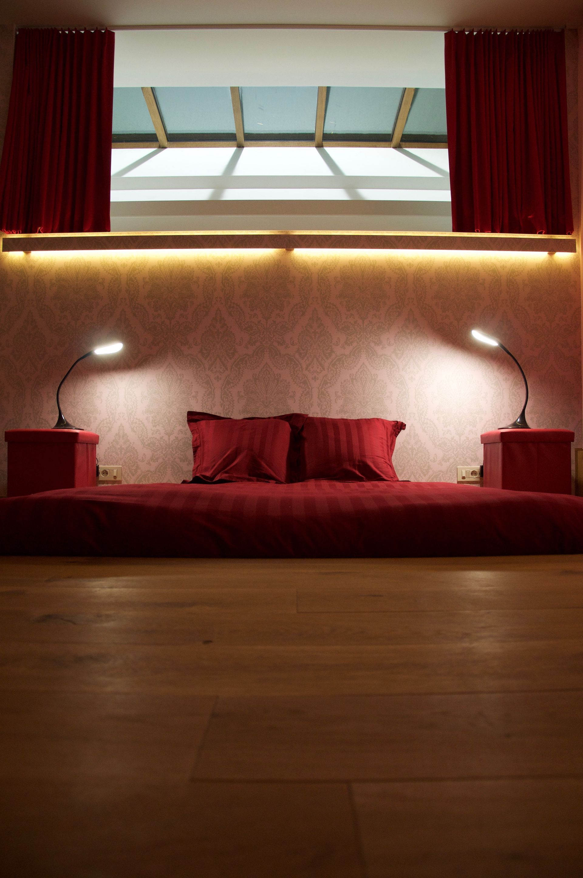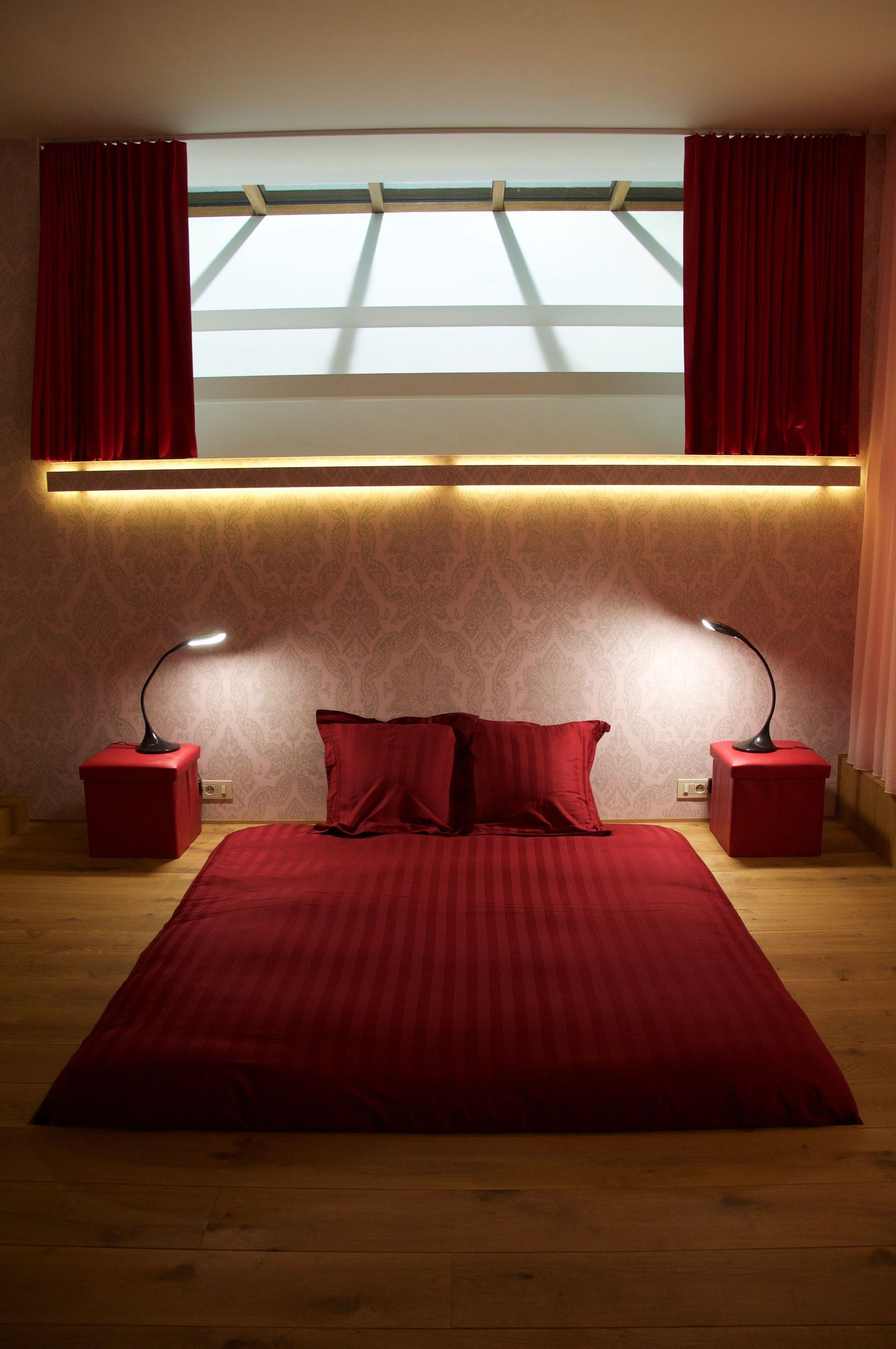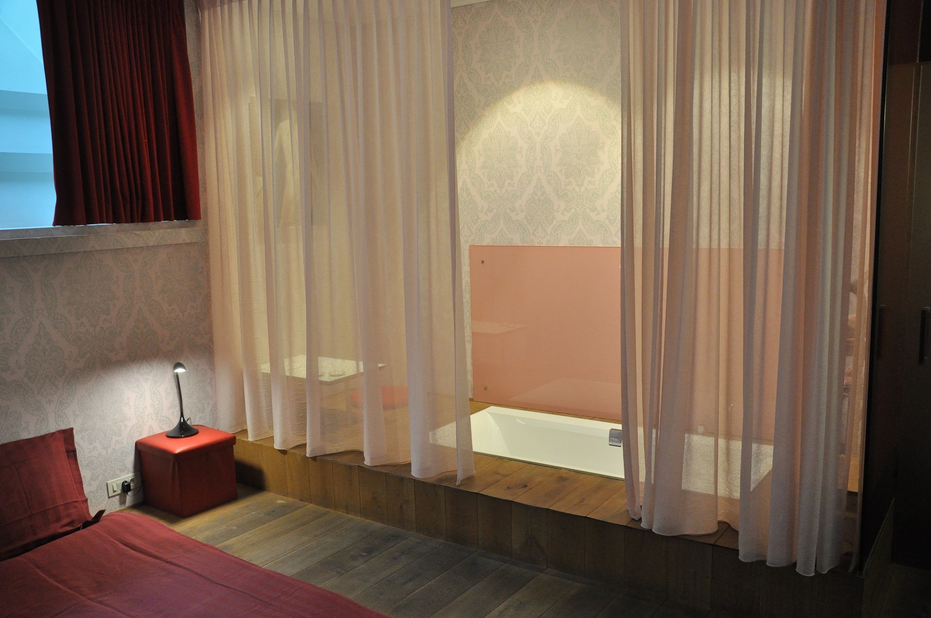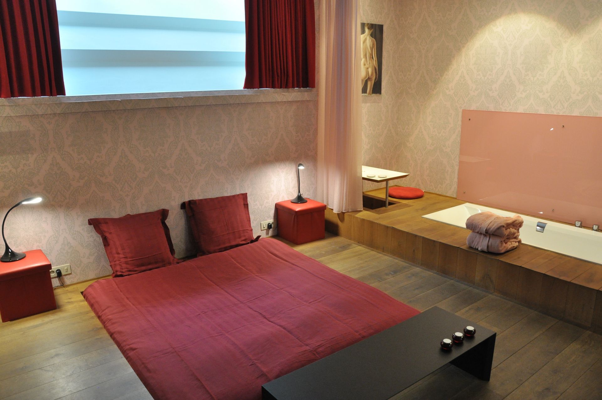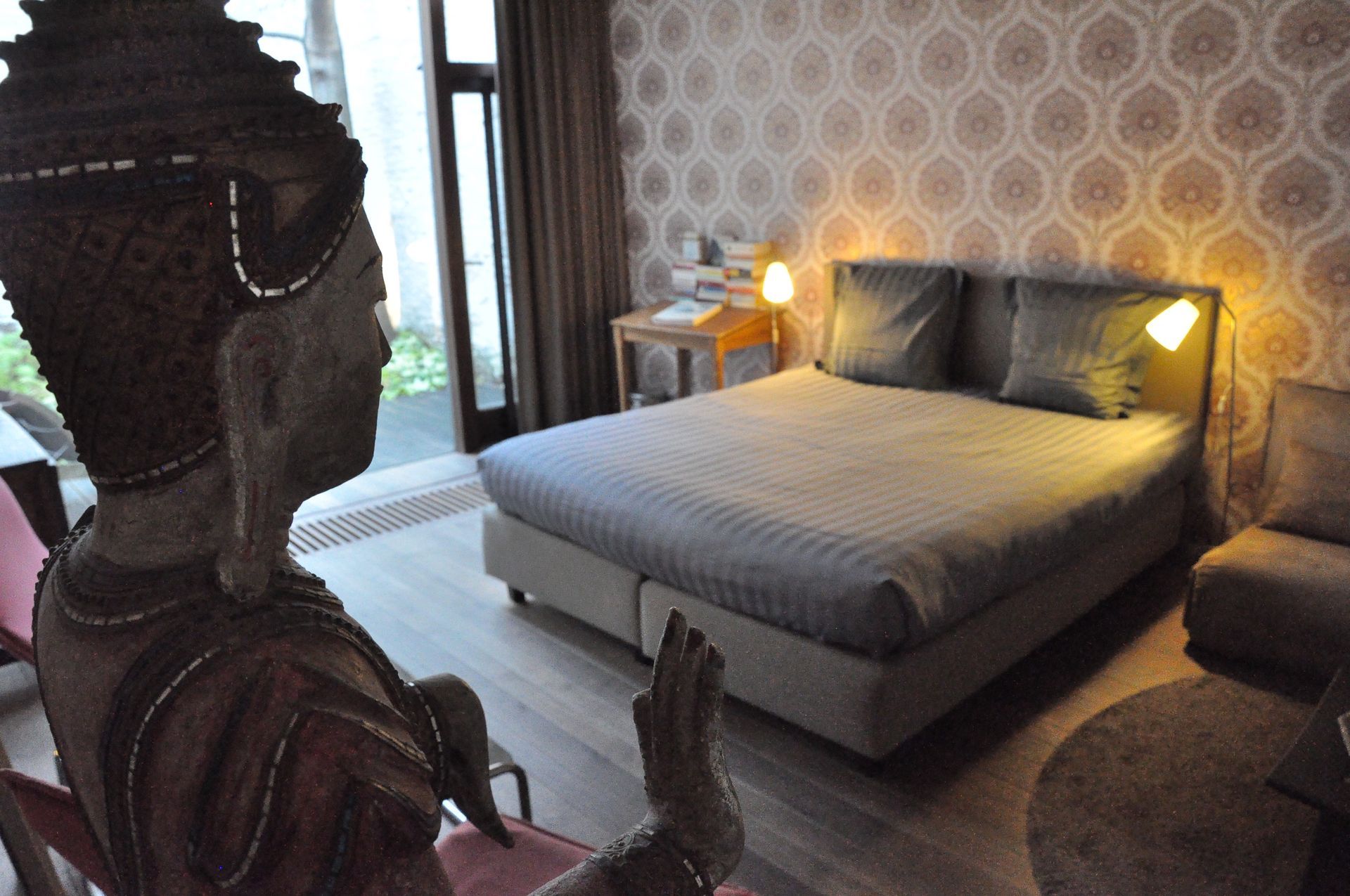 In the Honeymoon suite you stay and sleep surrounded by books and art works by beginning talents (studying in the nearby art schools) as well as by established artists. Some of the works in the room and in the windows are for sale, so in a way you’ll be staying in an art gallery. Bath and bed are ‘Japanese style’ built in the floor, and there’s a kitchenette.
