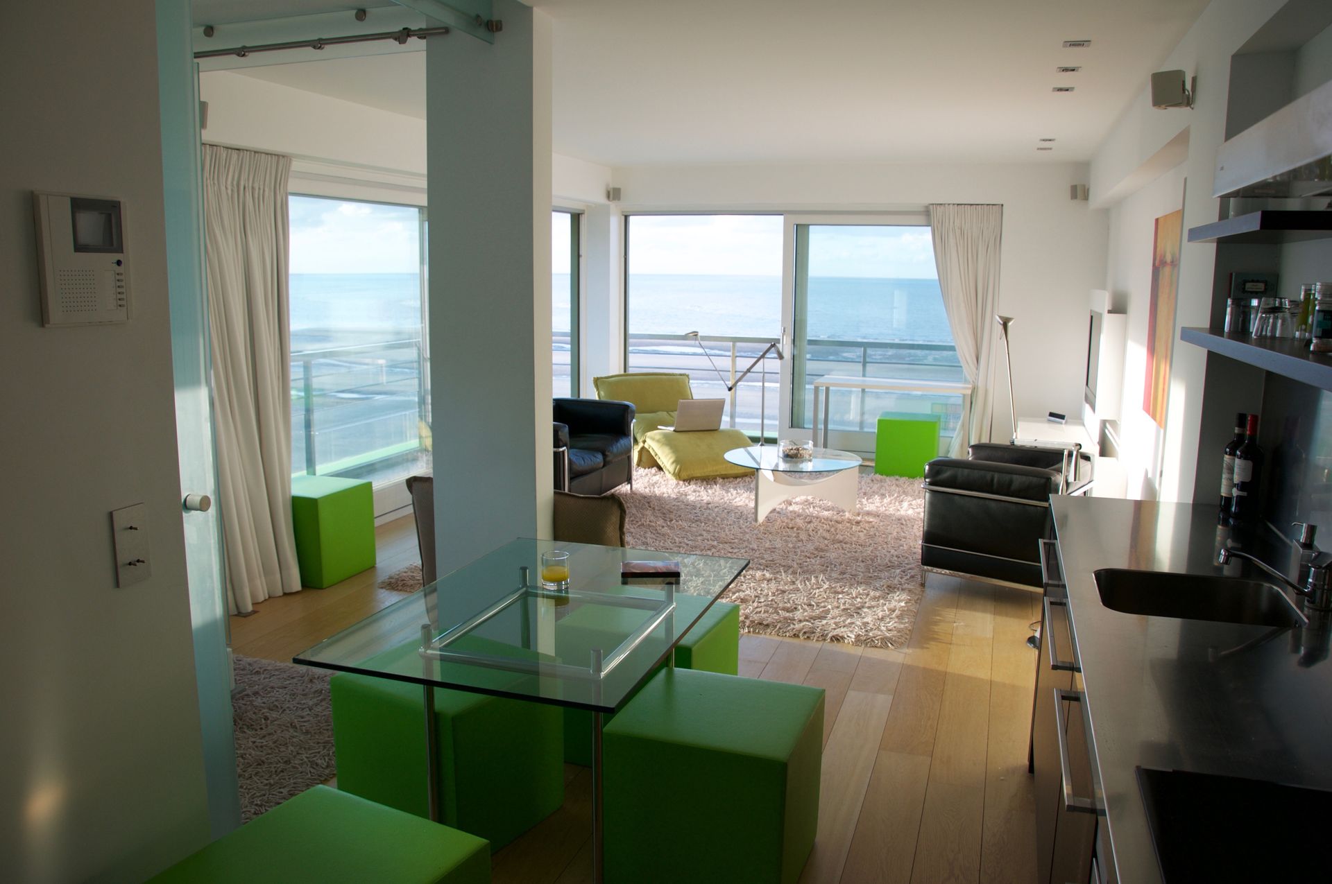 Our 5th floor design beach loft is located in a small residence (only 6 apartments) providing stunning panoramic ‘Spilliaert’ views over sea and beach. It features exquisite light due to the large windows and the open corner location, vintage Corbusier furniture, a bathroom with private hammam, and an open kitchen.